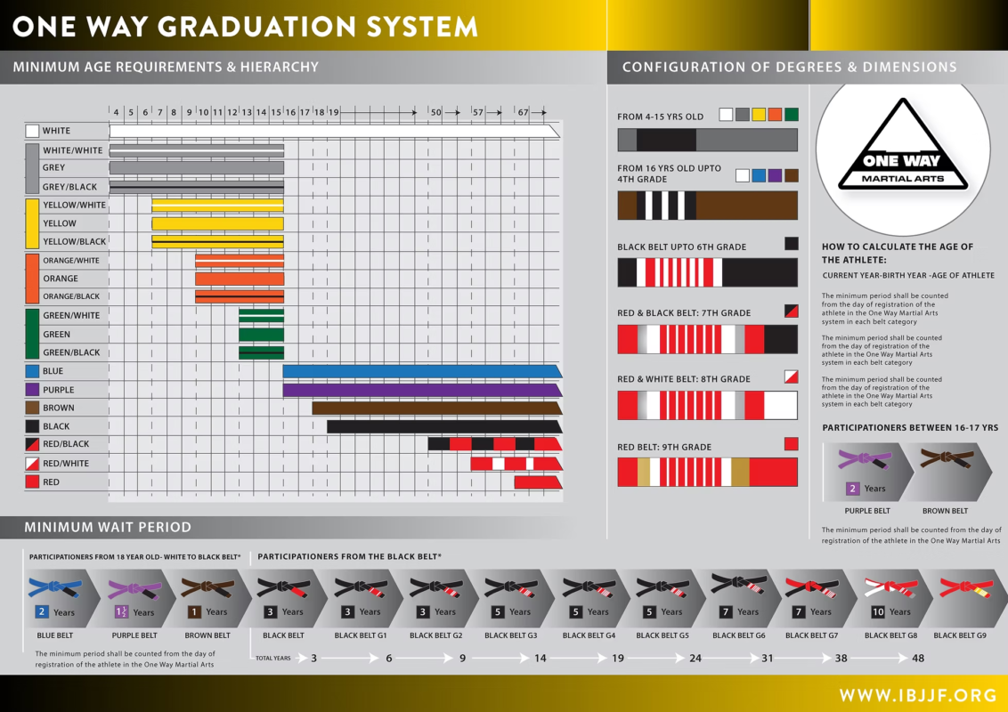 Black Belt Degrees (1st-6th): Black belts progress through degrees, each requiring years of training and teaching. The IBJJF sets minimum time requirements between degrees, typically 3 years for the first degree and increasing for each subsequent degree.​